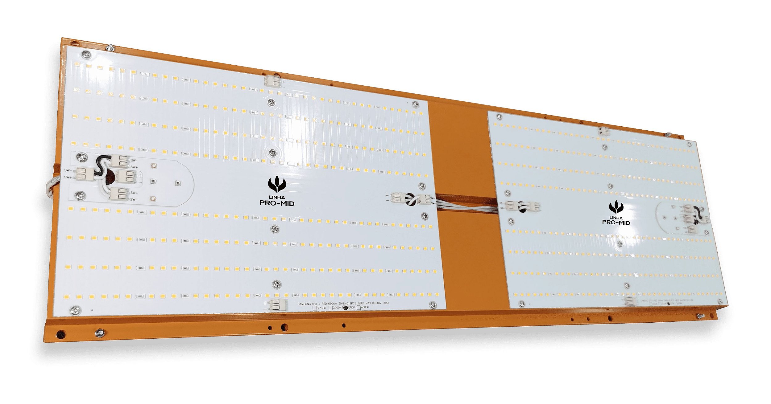 É uma placa de 240W aplicada de maneira horizontal, perfeita para distribuir a luz em grandes áreas de cultivo ou para cobrir áreas de metragens diferentes entre largura e comprimento.